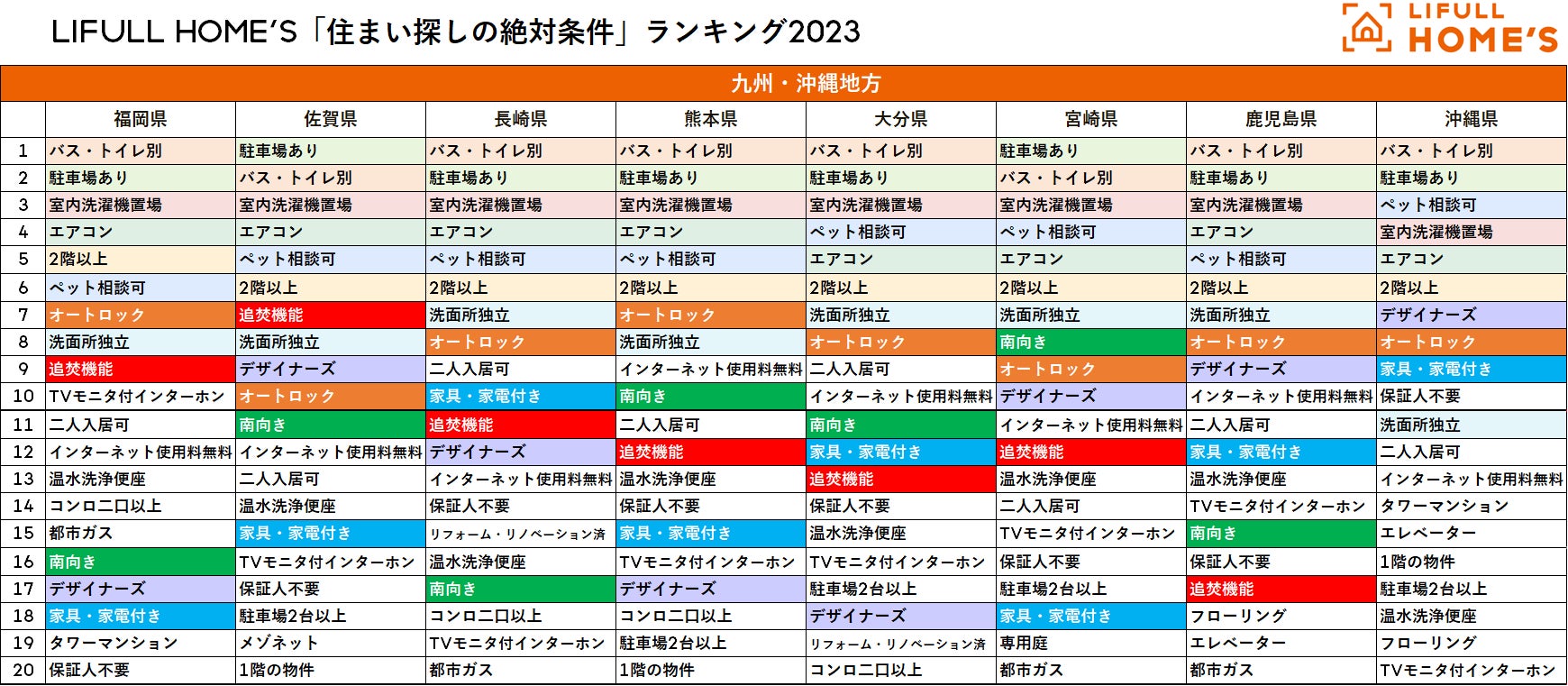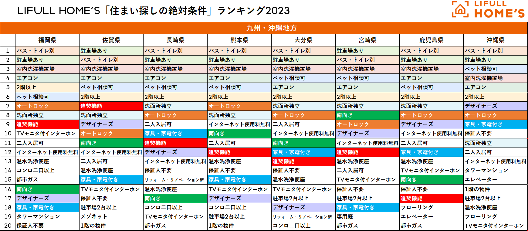 【九州・沖縄地方】沖縄県でも「追焚機能」「南向き」が上昇!「デザイナーズ」「家具・家電付き」は引き続き人気のTOP20入り!