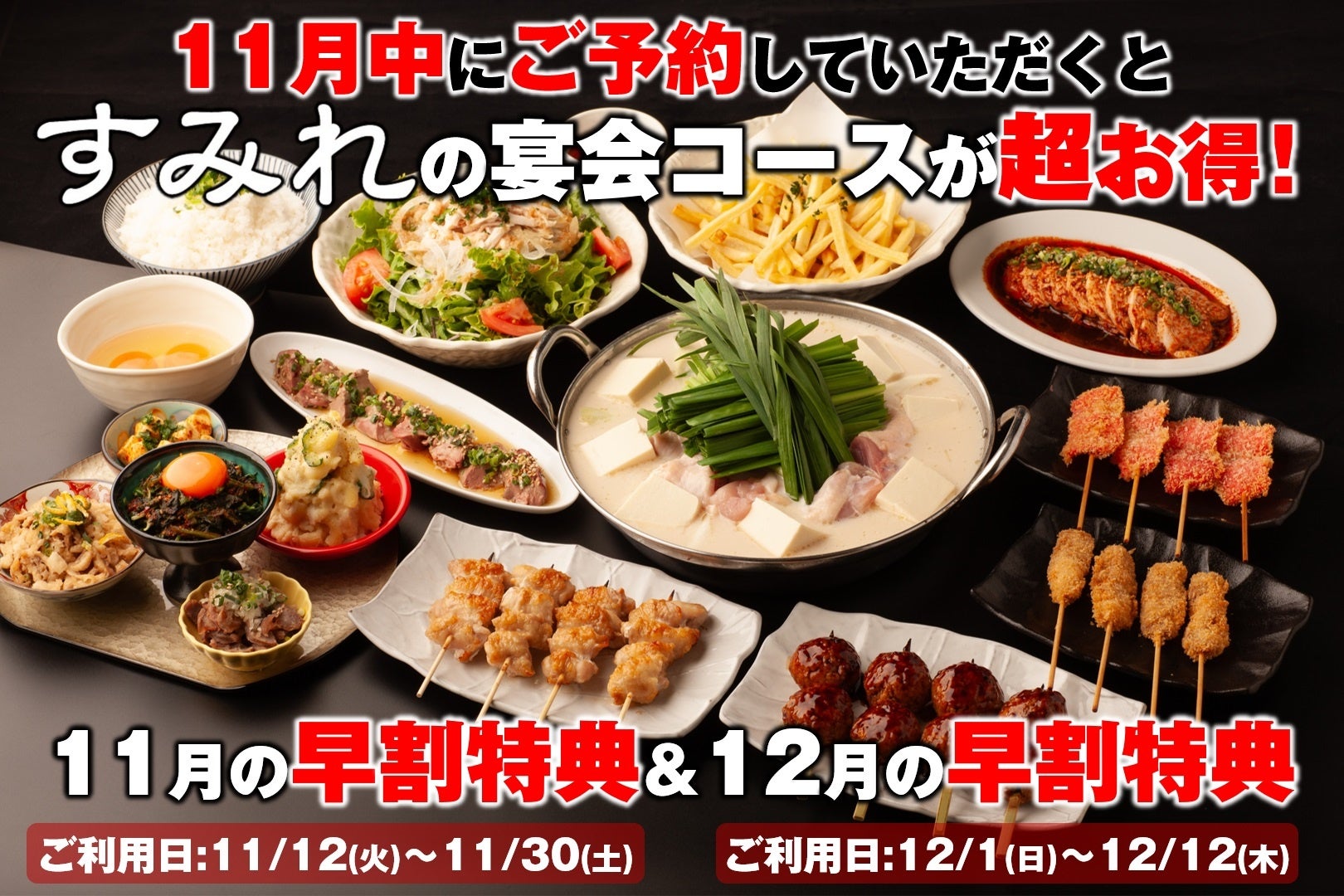 【11月予約限定】幹事様必見!3,500円から楽しめる忘年会プラン!3時間飲み放題や人気メニュー無料追加など特典満載!『やきとり家すみれ』の早割キャンペーン開催!