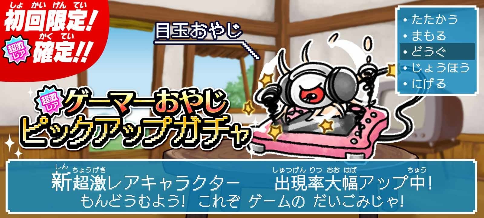 「ゲーマーおやじ」の出現確率アップに加えて、初回10回ガチャは超激レア確定のため、新キャラクターが手に入りやすい内容になっています。