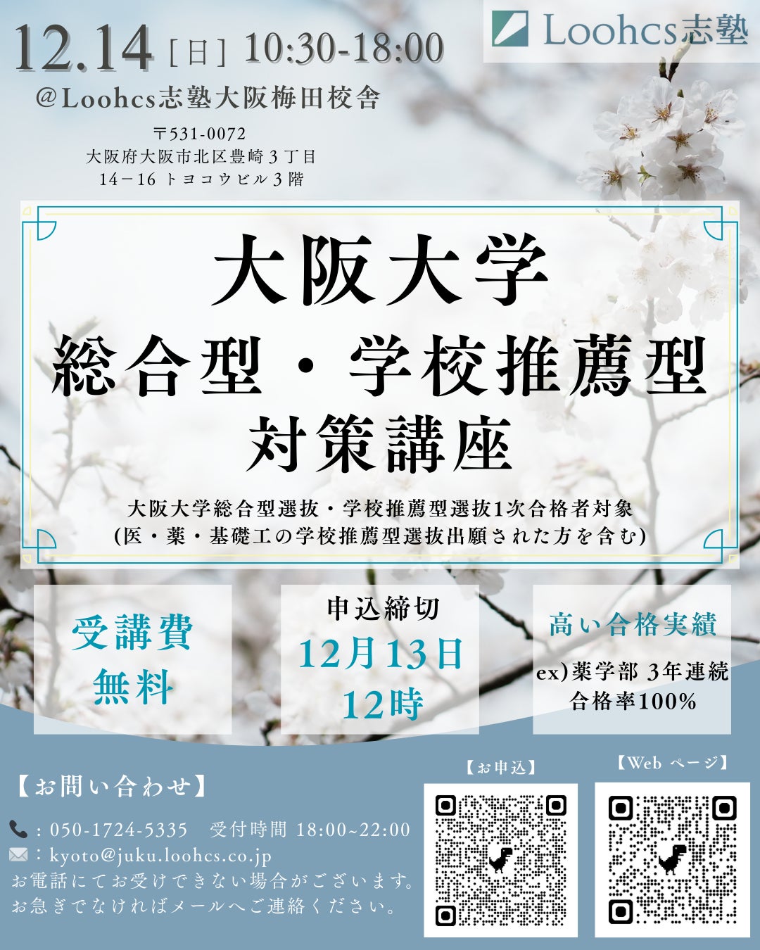 Loohcs株式会社(代表取締役:嶺井 祐輝、本社所在地:東京都渋谷区桜丘町)は、同社が運営する総合型選抜・AO推薦入試専門の学習塾「ルークス志塾 大阪梅田校」において、大阪大学総合型選抜・学校推薦型選抜の一次合格者(医・薬・基礎工学部の学校推薦型選抜出願者も含む)を対象に、取材協力いただいた方限定で「阪大総合型・学校推薦型 対策講座」を無料で実施いたします。