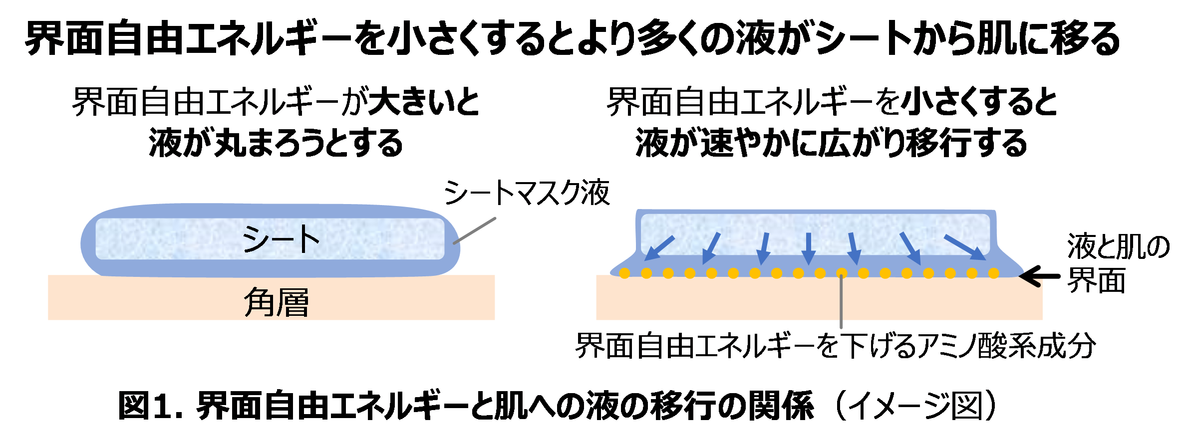 - 界面自由エネルギーを小さくすることでより多くの美容液を肌に移行させることに成功