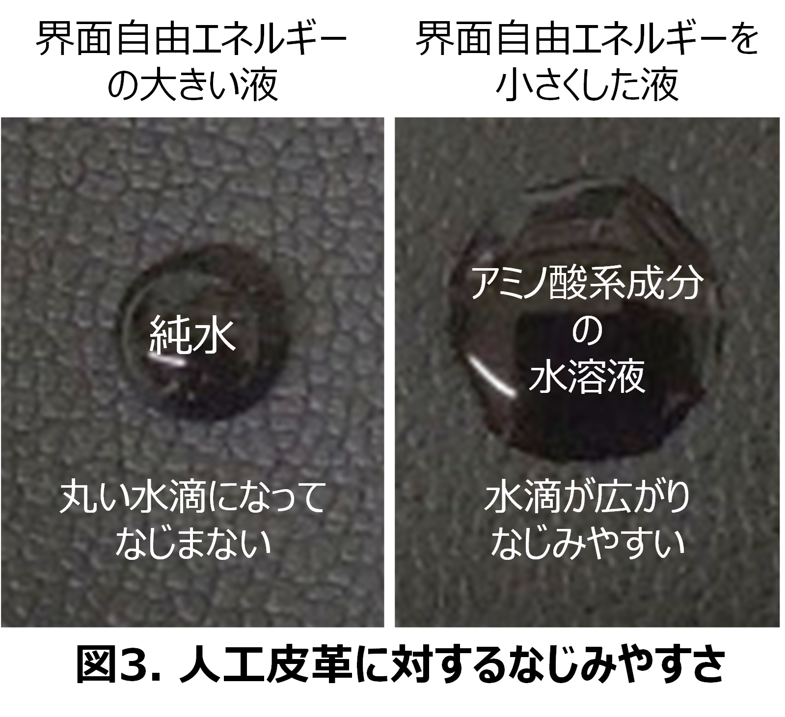 実際に、人工皮革に異なる2種類の液体を同じ量垂らし、その時の広がり方を観察すると、界面自由エネルギーの大きい純水※1は丸く狭い範囲に留まっていますが、アミノ酸系成分を溶かし界面自由エネルギーを小さくした水溶液は、人工皮革の表面にうすく広がっていき、なじみやすいことが分かります(図3)。