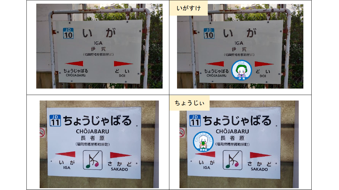 香椎線の駅に設置されている駅名標に駅それぞれのキャラクターが登場します。