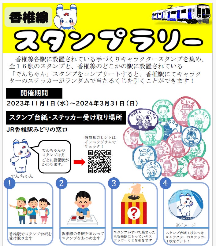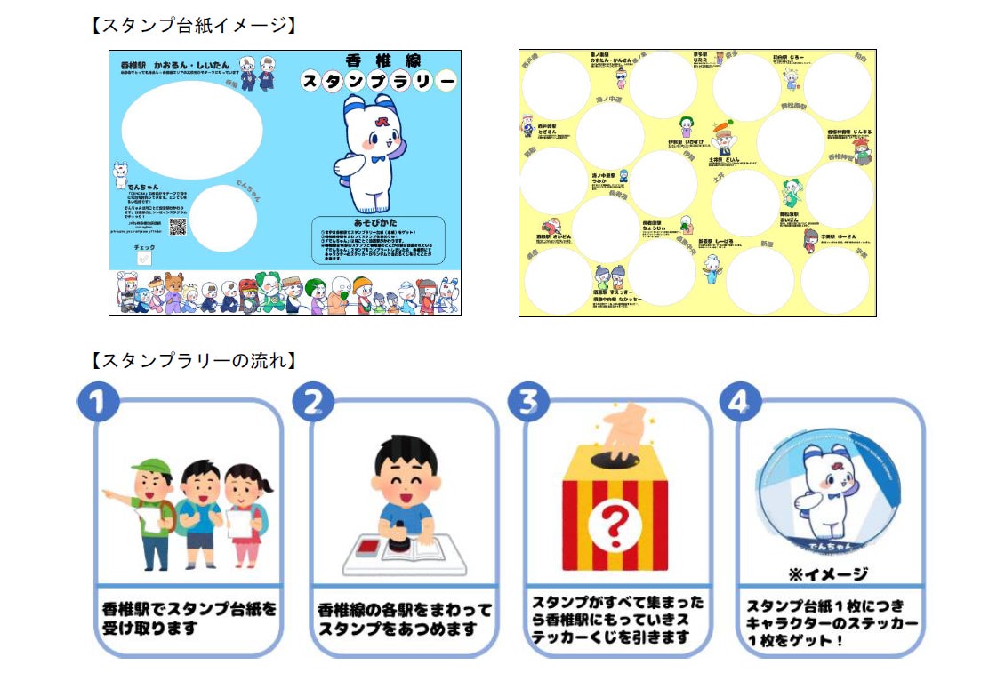 香椎線各駅に設置されている手づくりキャラクタースタンプを集めるスタンプラリーを開催します。全16駅のスタンプと、「でんちゃん」のスタンプをコンプリートして香椎駅で提示すると、キャラクターステッカーがランダムで当たるくじを引くことができます。