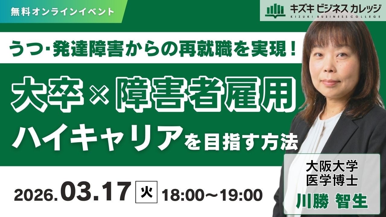 就労移行支援事業所・キズキビジネスカレッジ(KBC)は、2026年3月17日(火)に、大卒・キャリア層がうつ・発達障害から「自分らしいキャリア」を再構築するための無料オンラインセミナーを開催します。