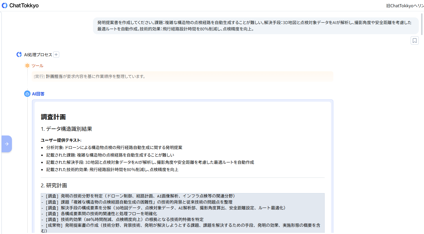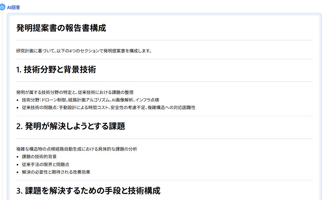 プラント設備の保守点検では、ドローンによる安全かつ精度の高い自律飛行が求められている。しかし、複雑構造物に対する点検経路設計は手作業に依存し、担当者の経験差が作業効率と品質に影響していた。この課題を解決する自動経路生成アルゴリズムの研究開発を進めていたが、研究過程で生じる情報から発明要素を抽出し、先行技術との差分を整理する作業に時間がかかるという課題があった。