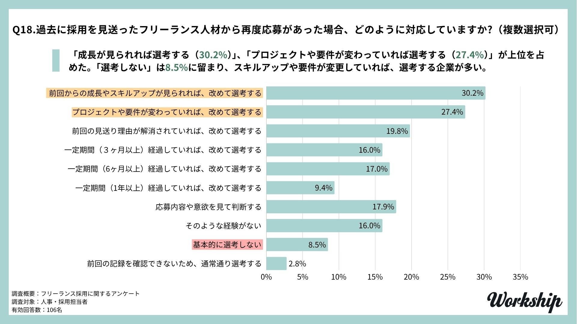 過去に採用を見送ったフリーランス人材から再応募があった場合、「前回からの成長やスキルアップが見られれば、改めて選考する」が30.2%で最も多く、次いで「プロジェクトや要件が変わっていれば、改めて選考する」が27.4%となりました。