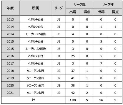 J1リーグ 33試合(0得点) / J2リーグ 158試合(5得点)
