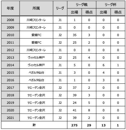 J1リーグ 10試合(0得点) / J2リーグ 265試合(29得点)