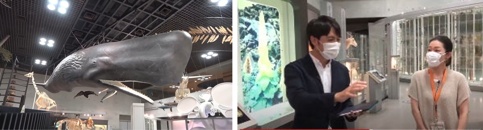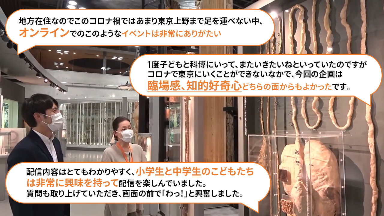 海棲哺乳類学を専門とする田島木綿子(動物研究部椎動物研究グループ研究主幹)が製作に携わったマッコウクジラの標本資料等を見ながら展示解説しました。配信中は桝アナと共に、視聴者からリアルタイムで届く質問や疑問に答えました。ライブ配信中の視聴者は1,700人を超え、アーカイブ動画は8,800回以上再生されました。(2022年2月17日現在)