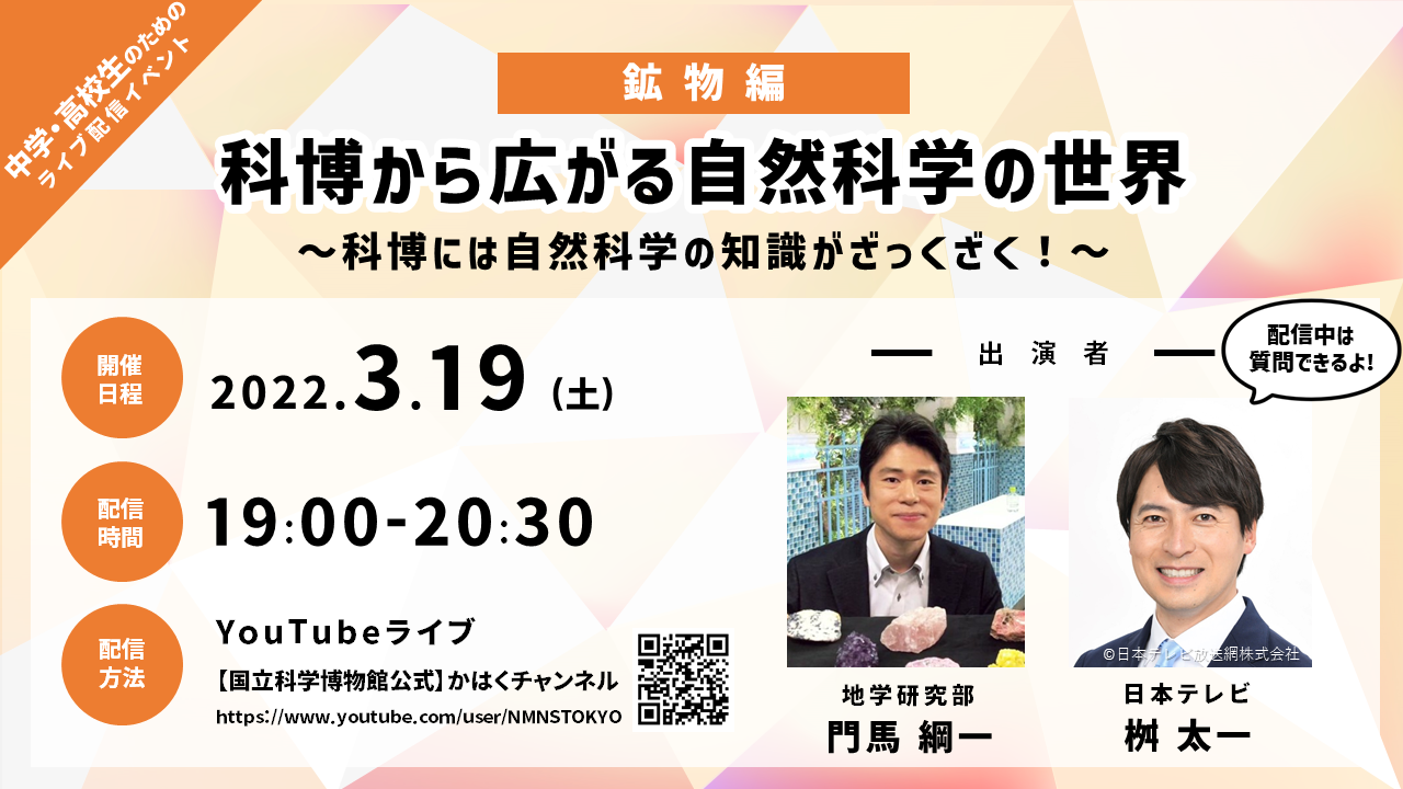 国立科学博物館(館長:篠田謙一)は、日本テレビアナウンサー 桝太一さんと地学研究部 門馬綱一研究主幹による、YouTubeライブ配信イベント『【鉱物編】科博から広がる自然科学の世界 ~科博には自然科学の知識がざっくざく!~』(配信日時:2022年3月19日(土)19:00~予定)を実施します。