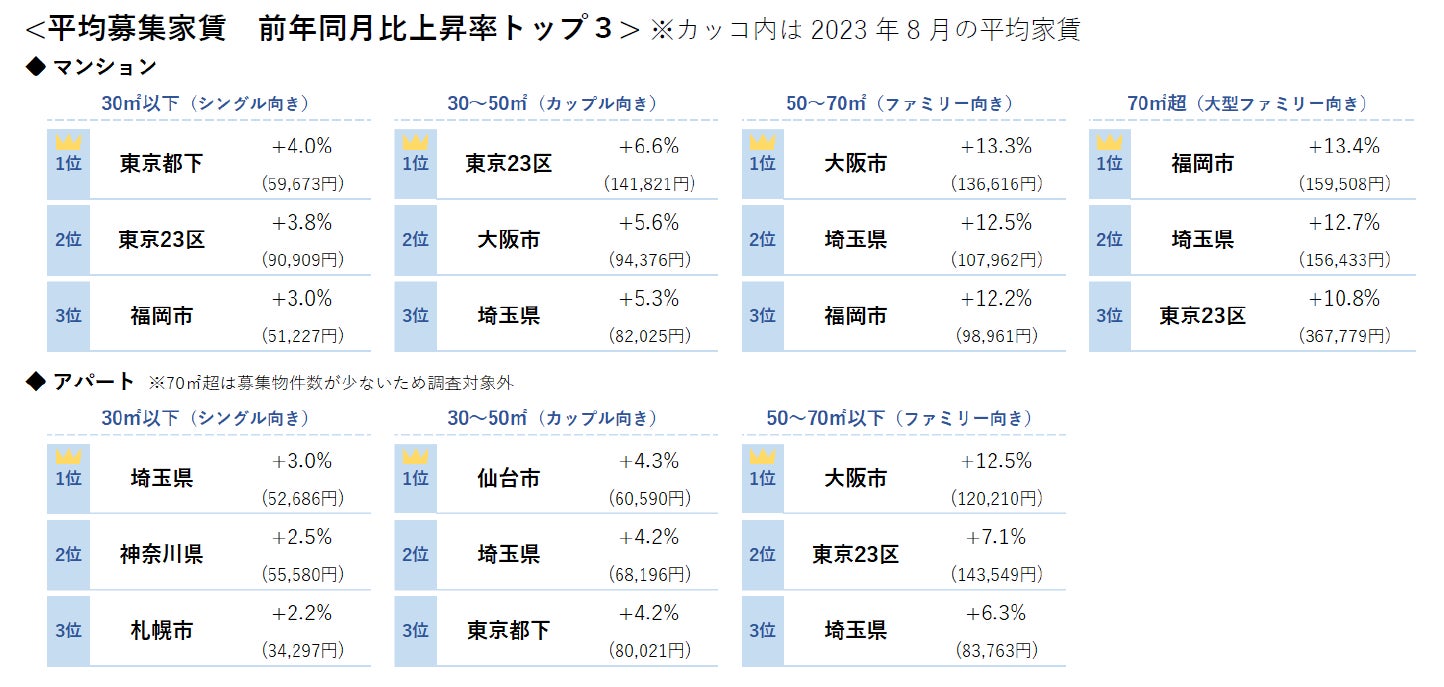 マンションの平均募集家賃は、東京23区・東京都下・埼玉県・名古屋市・大阪市・福岡市の6エリアが前月に続き全面積帯で前年同月を上回る。