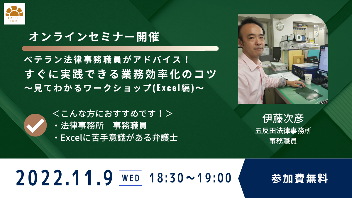 法律関連出版物、各種データベースを提供する第一法規株式会社(所在地:東京都港区、代表取締役社長:田中 英弥)は『ベテラン法律事務職員がアドバイス!すぐに実践できる業務効率化のコツ~見てわかるワークショップ(Excel編)』を2022年11月9日に開催いたします。