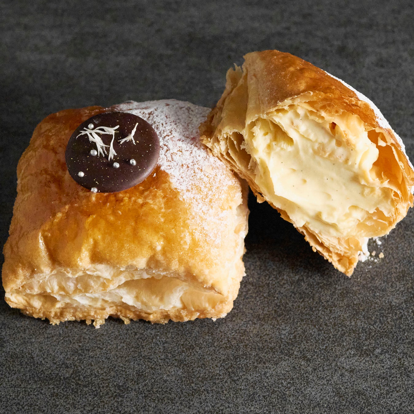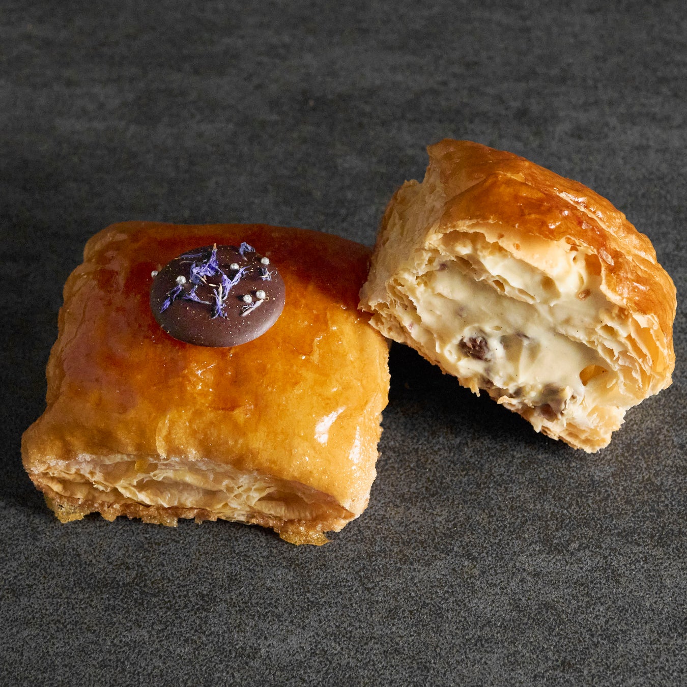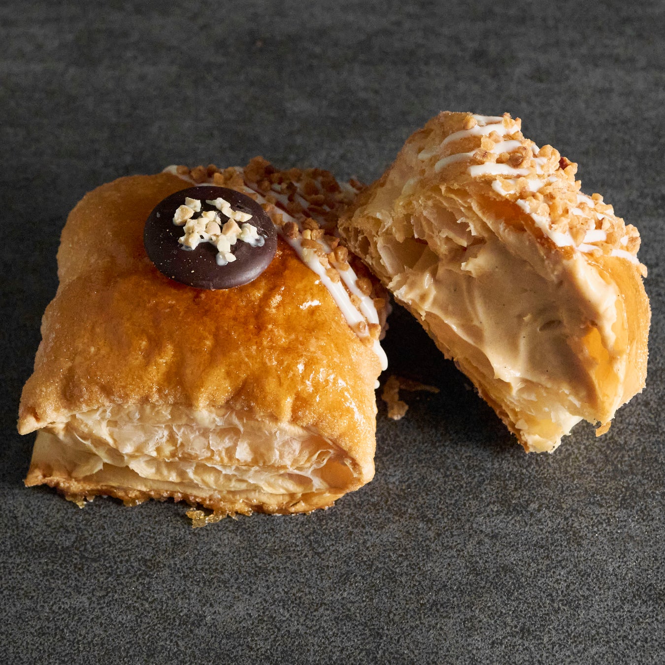 何層にも丁寧にバターを練りこんだパイ生地を、オーブンの中でふっくらと膨らませ、表面はキャラメリゼして香ばしく焼き上げました。