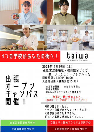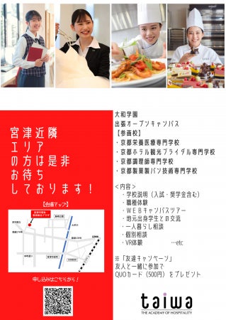 2022年11月19日(土)学校法人大和学園グループは京都府宮津市へ出張し、栄養・医療事務・調理・製菓・製パン・ホテル・旅行・観光・ブライダルに興味のある方を対象としたオープンキャンパスを実施します。世界観光都市「京都」で学ぶ魅力や、ホスピタリティ業界で働く魅力について丁寧に説明します。ホスピタリティ業界に興味がある方はぜひこの機会にご参加下さい。(新型コロナウイルス感染症予防対策として、マスクの着用や検温、アルコール消毒を十分に行い、3密を避けて実施いたします。)