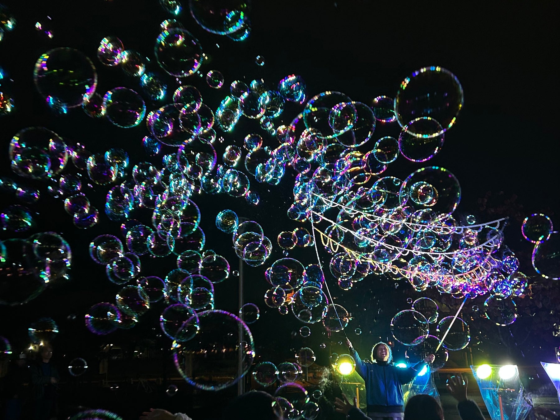 イルミネーションが煌めく中で、シャボン玉のパフォーマンスを開催します。ライトアップされた東京ドームシティをシャボン玉でさらに華やかに彩ります。