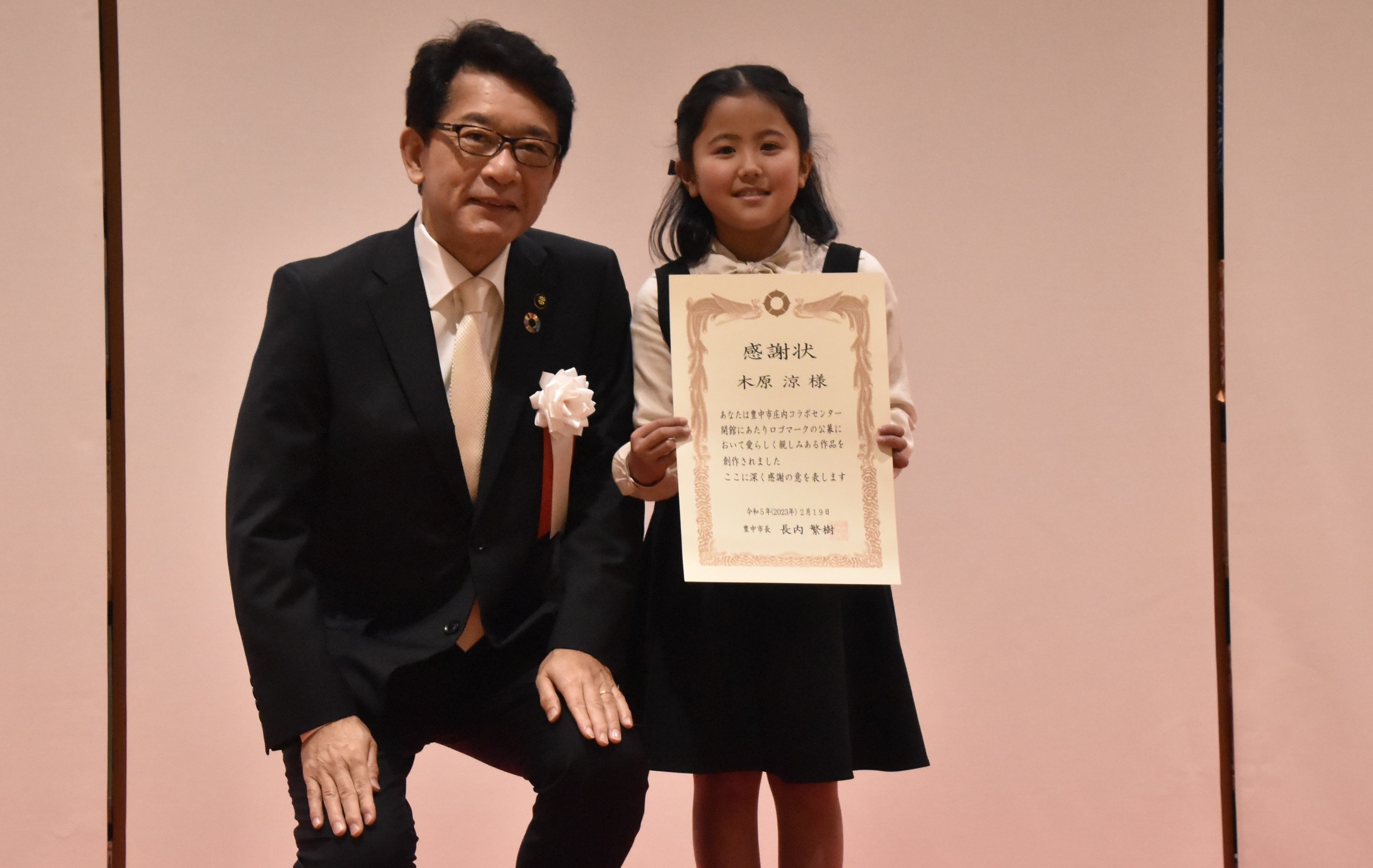 愛称の「ショコラ」にちなんだロゴマークを公募。応募総数30人、35件の中から、市立庄内小学校3年生・木原涼さんの作品が選ばれました。