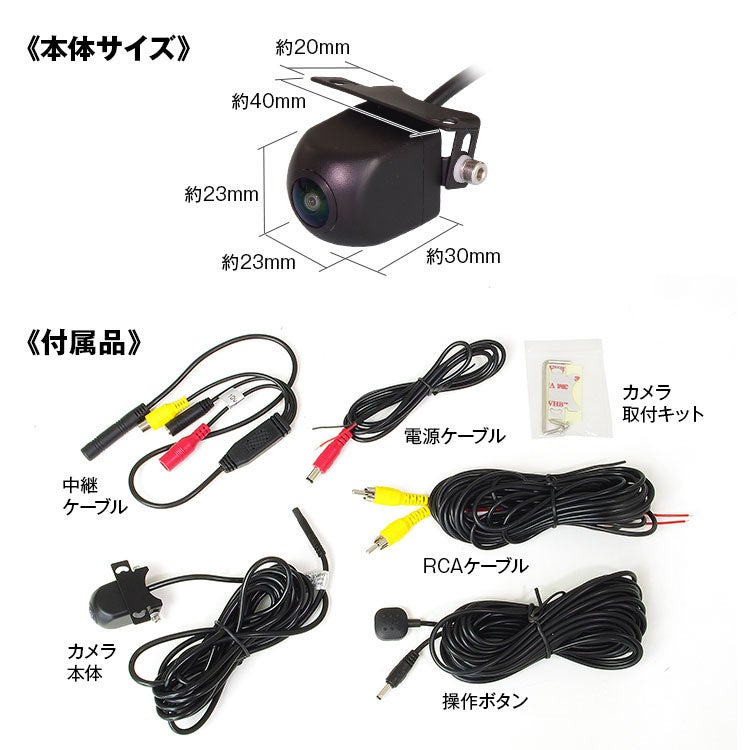 カメラ本体(ケーブル約2.9m)×1、操作ボタン(ケーブル約5.9m)×1、電源ケーブル(約1.1m)×1、中継ケーブル(約0.5m)×1、RCAケーブル(約6.4m)×1、カメラ取付キット×1