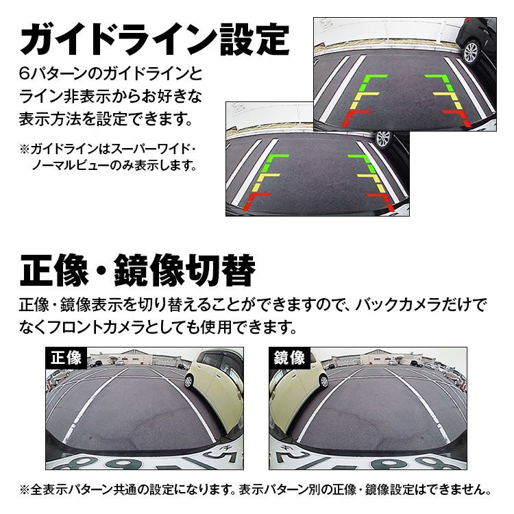 超広角180°のスーパーワイド表示、従来のバックカメラに近い画角のノーマル表示、死角になりがちな左右サイド拡大表示、下方を俯瞰表示、さらにスーパーワイド+左右サイド分割表示、スーパーワイド+下方の分割表示の6種類の表示パターンを切り替えることができます。