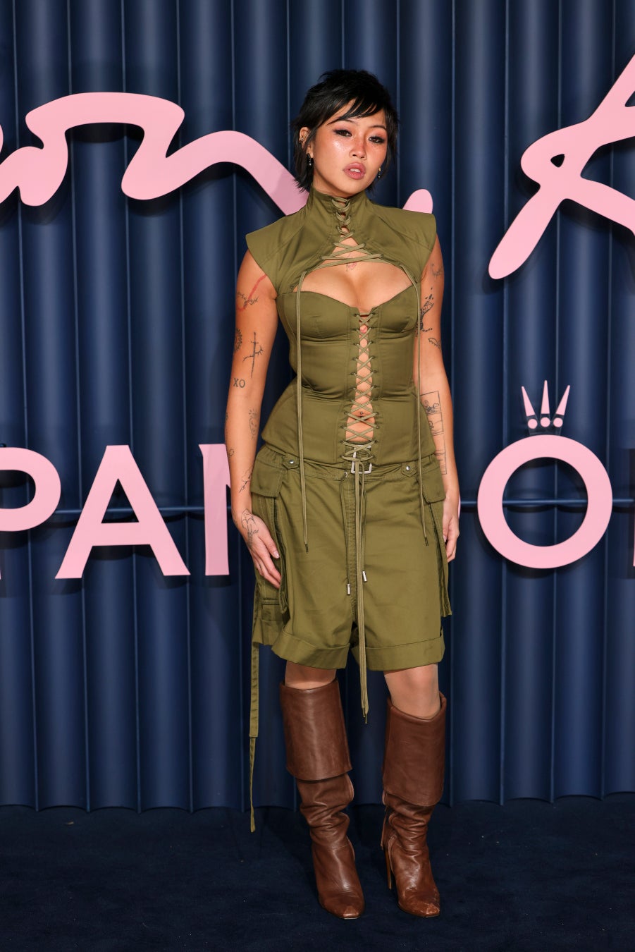 2026年春夏コレクションより、オリーブカラーのコットンツイルにレースアップを施したハーネスコルセットトップとカーゴショーツに、ブラウンレザーのホーンヒールブーツ、シルバーメタルのスカル&パール イヤリングを合わせています。