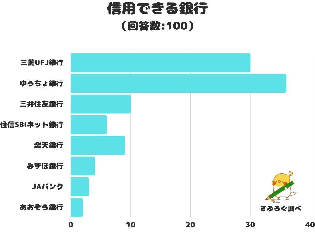 信用できる銀行をアンケートにて調査したところ、1位は「ゆうちょ銀行」 でした。
