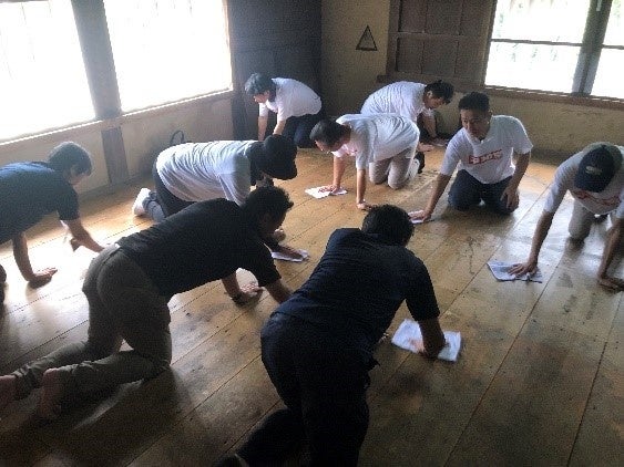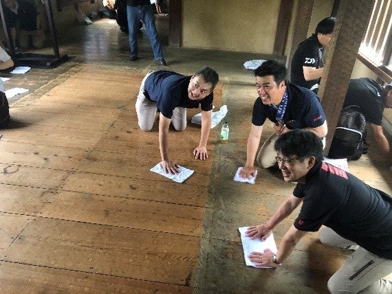 当日は、熱中症対策として早朝に実施されたものの蒸し暑く、HKB参加者はこまめな水分・塩分補給をしながら、市民の皆さま約180名と一緒に、彦根城の天守閣や西の丸三重櫓などの床の乾拭きを約30分間行いました。