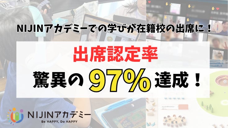 株式会社NIJIN(本社:東京都江東区、代表取締役:星野達郎)が運営する不登校オルタナティブスクール『NIJINアカデミー』では、NIJINアカデミーでの活動を在籍校に出席認定として認められている出席認定率が97%に達したことをお知らせいたします。(2025.1月現在)