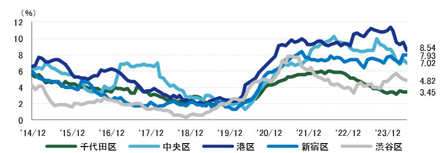区別の潜在空室率は、港区で前月から1ポイント超の大幅な低下となった。昨年、港区の潜在空室率は空室を抱えた新築ビルの竣工が続いたことで空室率同様に上昇し、2023年7月には11%台に達した。その後も都心5区で最も高い水準で推移しているが、今年に入ってからは低下傾向に転じ、直近は8%台半ばまで低下している。