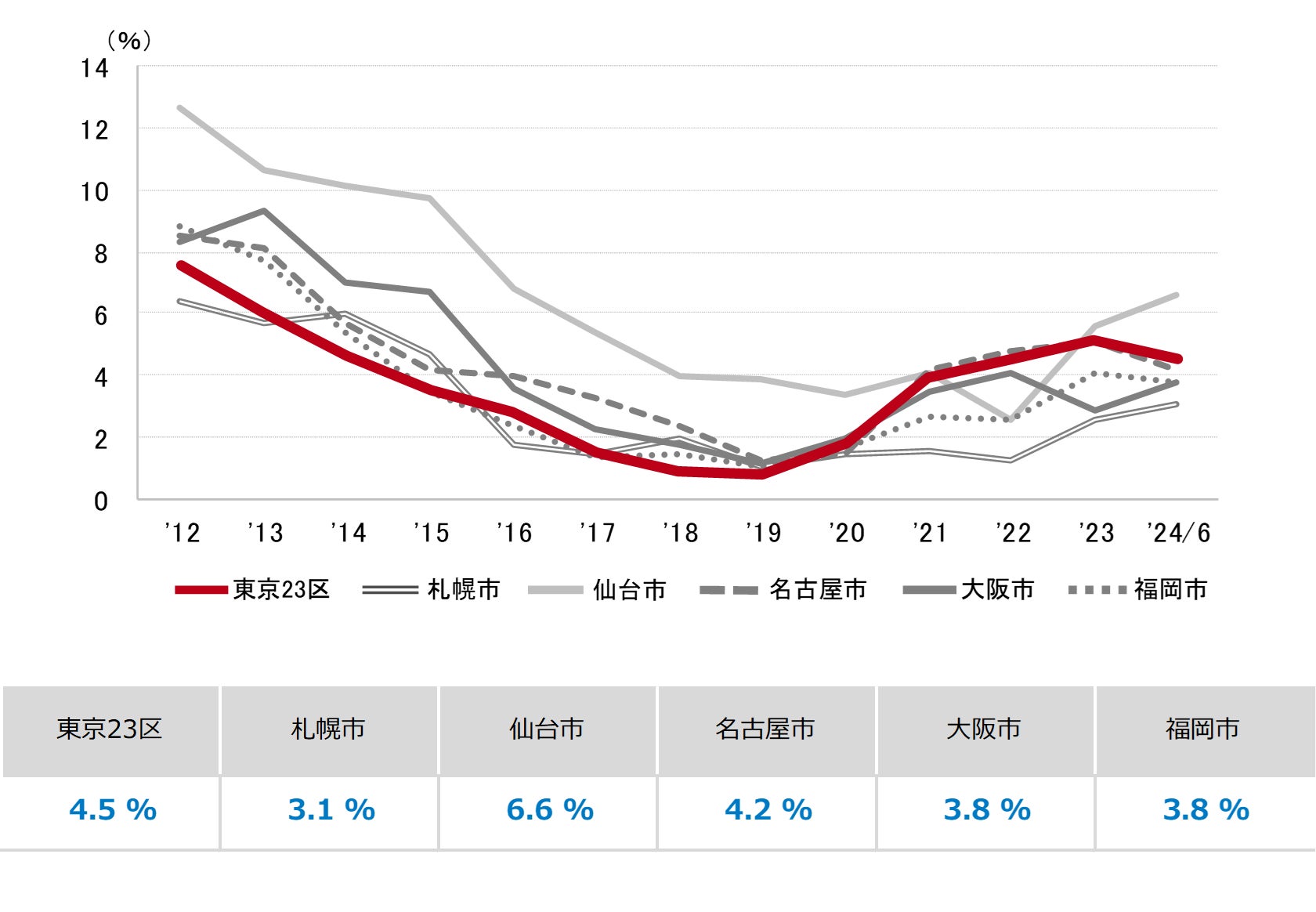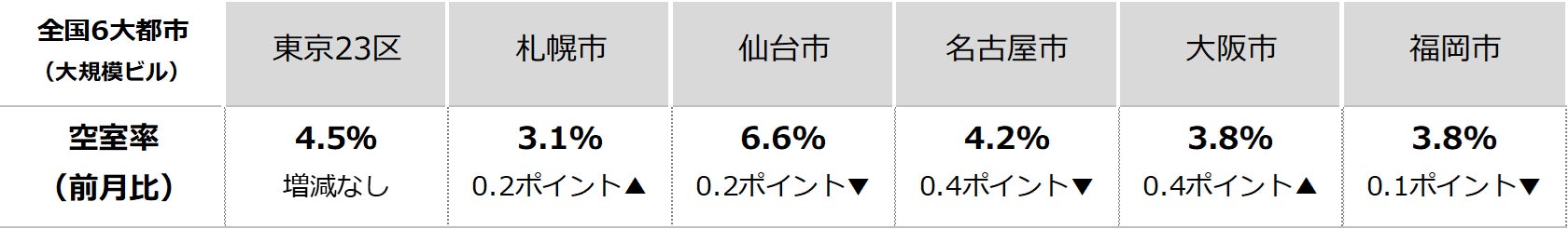 三幸エステート株式会社(本社:東京都中央区、取締役社長:武井重夫)は、2024年6月度の東京都心5区(千代田区、中央区、港区、新宿区、渋谷区)および全国6大都市(東京、札幌、仙台、名古屋、大阪、福岡)の大規模ビル※1のマーケットデータをまとめた「オフィスマーケット2024年7月号」を公表します。