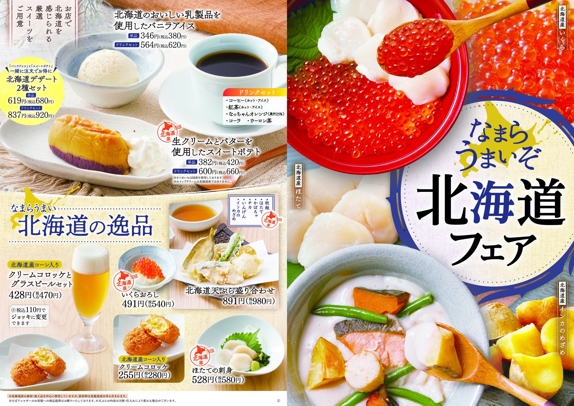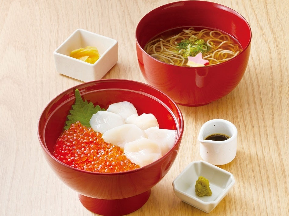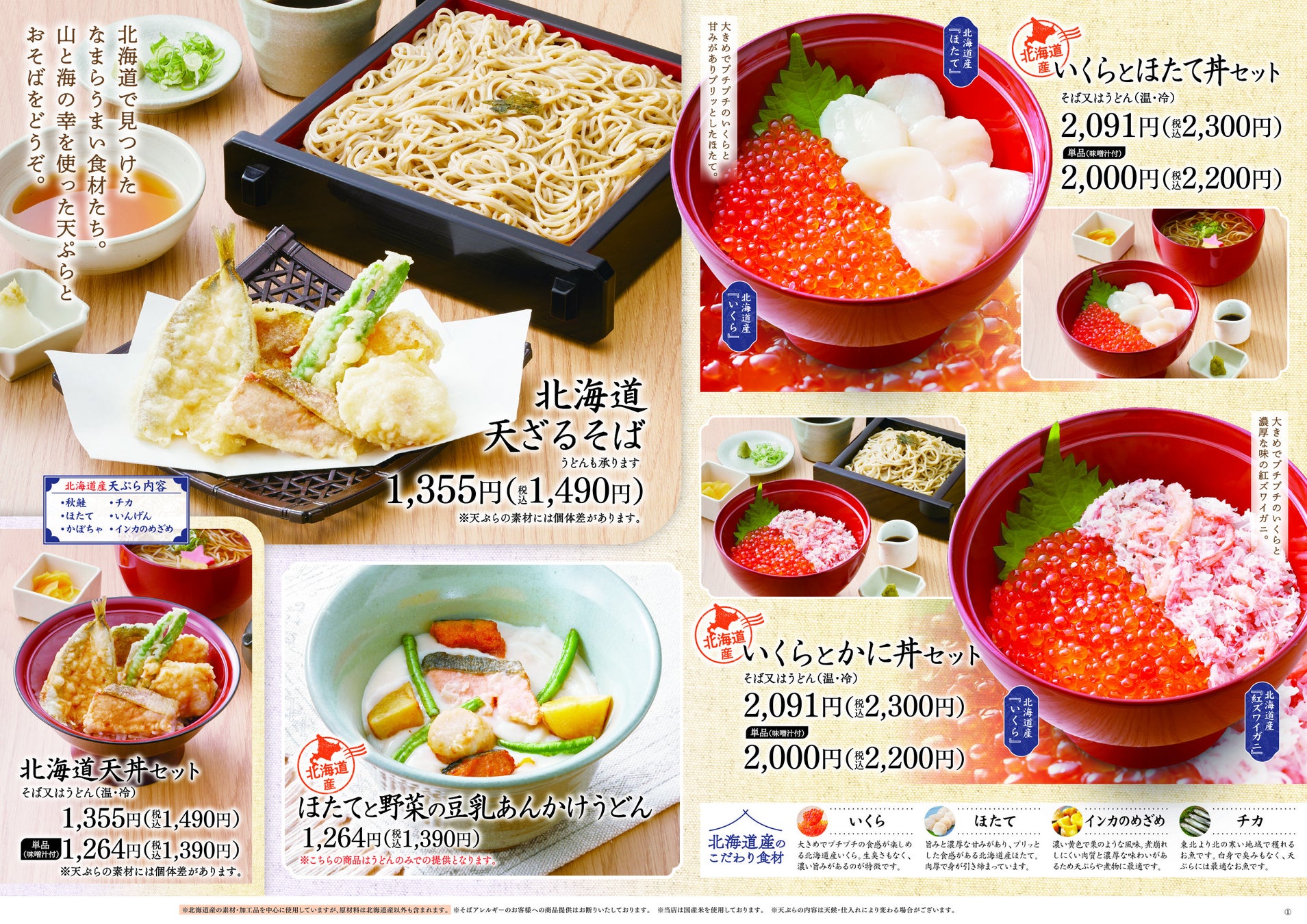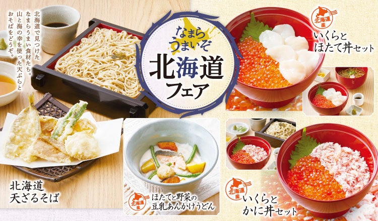 北海道といえば、新鮮な魚を使用した海鮮丼。今年は、2種類の海鮮丼「いくらとほたて丼セット」「いくらとかに丼セット」と北海道の食材を天ぷらに仕上げた「北海道天ざるそば」、昨年も人気だった、「ほたてと野菜の豆乳あんかけうどん」をご用意しております。
