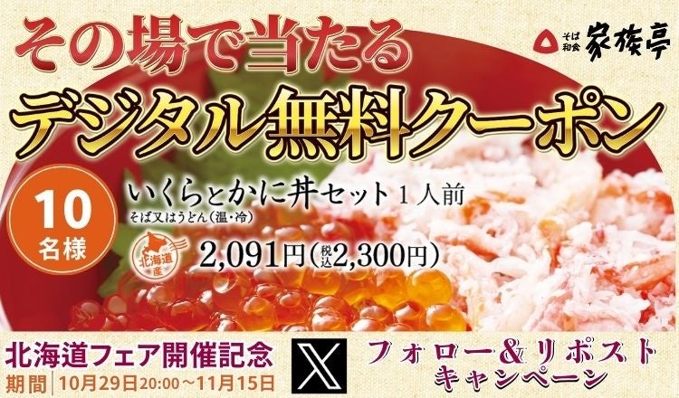 また、なまらうまいぞ北海道フェアの開催を記念して、「いくらとかに丼セット1人前」デジタル無料クーポンが抽選で10名様に当たる家族亭公式Xフォロー&リポストキャンペーンも同時開催いたします。