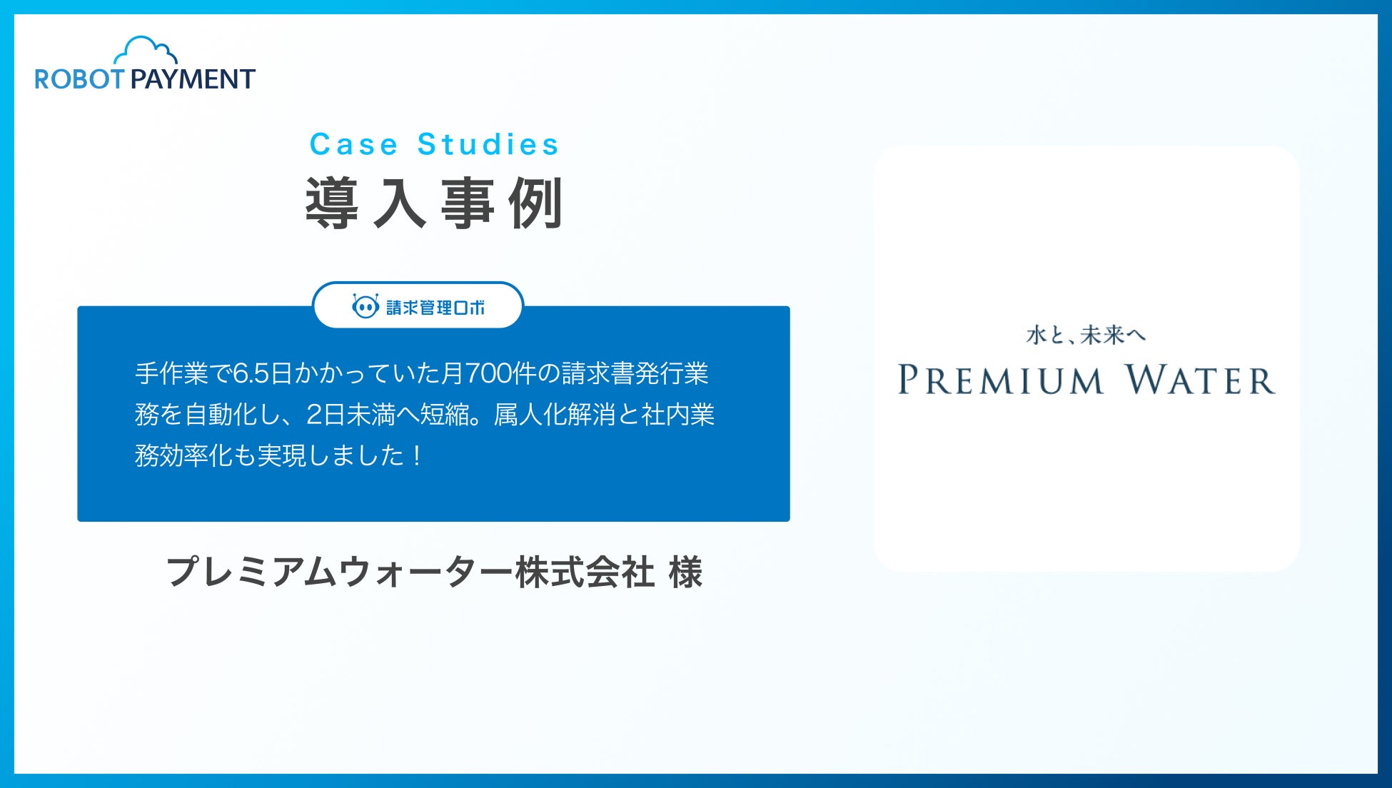 株式会社ROBOT PAYMENT(本社:東京都渋谷区、代表取締役:清久 健也、証券コード:4374、以下「ROBOT PAYMENT」)は、請求・債権管理システム「請求管理ロボ」が、プレミアムウォーター株式会社(以下 「プレミアムウォーター」)の導入事例を公開したことをお知らせします。