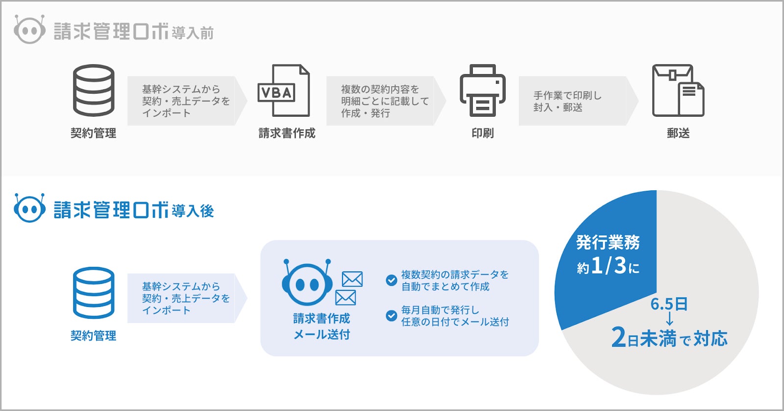 請求管理ロボ導入後は、複数契約を持つ法人顧客向けの合算請求書を自動で作成できるようになり、発行業務にかかる時間は6. 5日から2日未満に短縮される見通しです。作業の属人化も解消され、発行担当者以外でも請求書の検索や参照が可能となったことで、社内の問い合わせ対応もスムーズになりました。今後はメール送信の導入にあわせ、決済期限通知や催促メール機能の活用も予定されています。