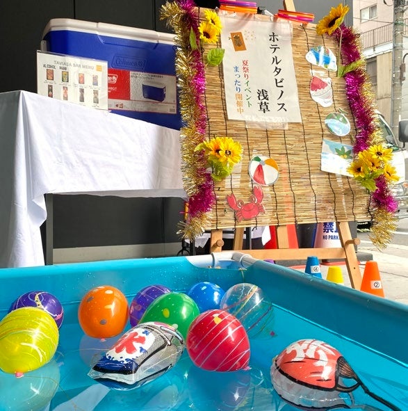 夏の風物詩の1つといえば夏祭り。ホテルタビノスでも館内にて夏祭りを開催いたします。輪投げやスーパーボールすくい、ヨーヨー釣り等、各館で工夫を凝らした縁日の催しをお楽しみいただけます。また、ロビー装飾も夏祭りを意識するなど、館内にいるだけで”日本の夏”らしさが感じられます。