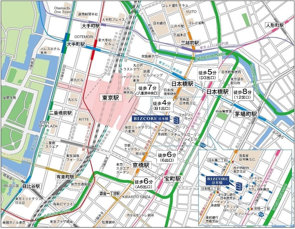 ・各線「日本橋」駅、「東京」駅等6駅10路線の利用が可能なマルチアクセスで交通利便性の高い立地です。