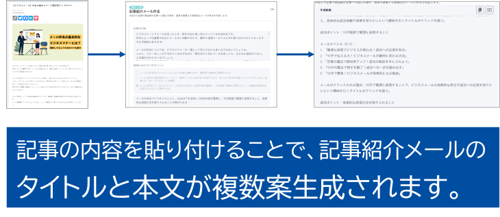 記事の内容を貼り付けることで、読者に伝えるべきポイントをAIと一緒に検討することができます。課題訴求、質問形式、サクセスストーリーなどのメール形式を選択すれば、読者に伝えるべきポイントに基づいたメールタイトルをAIが生成します。
