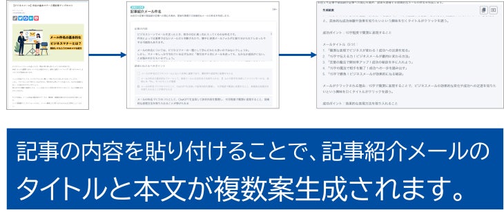 今回追加されたプロンプトテンプレートを使用すると、記事の内容を貼り付けるだけで、その記事を紹介するためのメールタイトルや本文をAIが複数案生成します。