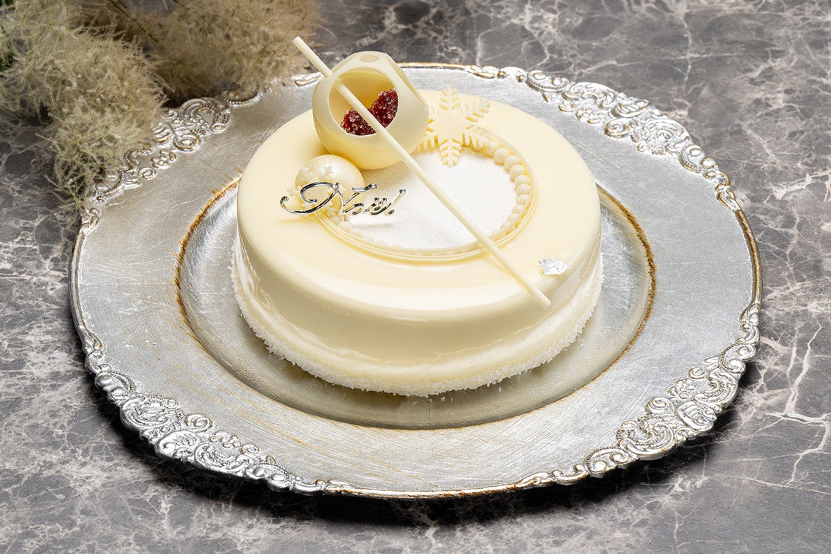 甘酸っぱいグリオットジュレとピスタチオクリームを軽い口溶けのバニラとマスカルポーネムースで包んだクリスマスケーキ。 食感のアクセントにもピスタチオを使用。真っ白な雪をイメージした純白のデザインに繊細な技術と味わいも楽しめる逸品。