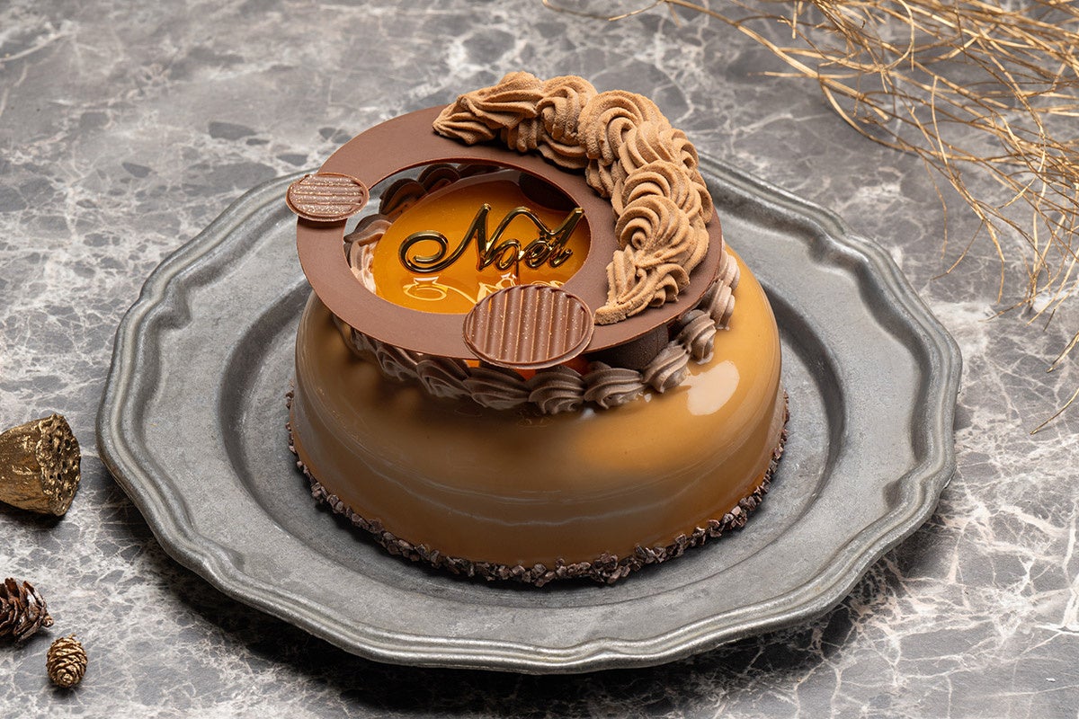 アプリコットのジュレと紅茶の香りを纏ったほろ苦いチョコレートムースに洋酒を効かせた大人の味わい。食感のアクセントには贅沢にスーパーフード「カカオニブ」を使用。アプリコットの鮮やかなオレンジ色とパティシエの技術が目を惹くチョコレートの装飾でシックに仕上げた大人のクリスマスケーキ。