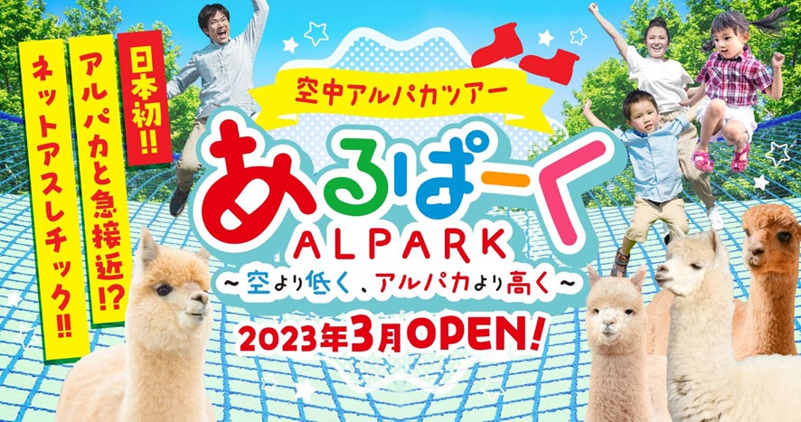 空中アルパカツアー『あるぱーく』は“歩く”、“アルパカ”、“パーク”の意味合いが込められた、日本初!?アルパカが放牧されたエリアにあるネットアスレチックです。