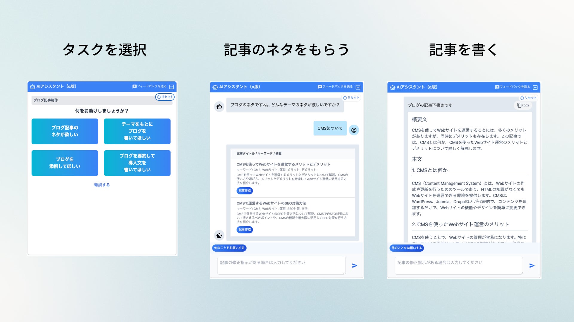 ①のテーマに応じた記事コンテンツの執筆の他、すでに思案していたテーマに基づいた構成(導入文・見出し・結論)の作成をAIアシスタントが代替します。