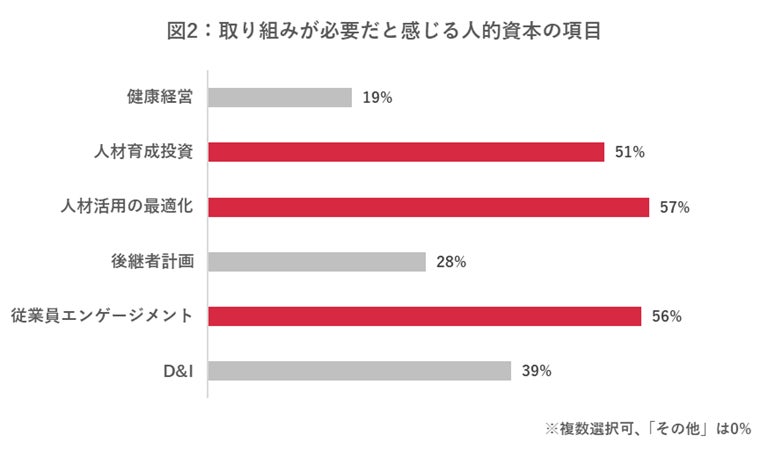 自社でさらなる取り組みが必要だと感じる人的資本の項目を複数選択で質問したところ、1位は「人材活用の最適化(57%)」で、2位に「従業員エンゲージメント(56%)」、3位に「人材育成投資(51%)」という結果となった。