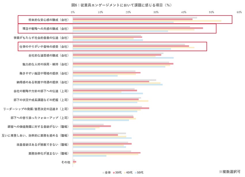 年代別で見ると、30代が感じる課題の1位は「理念や戦略への共感の醸成(46%)」、40代が感じる課題の1位は「将来的な安心感の醸成(53%)」、50代が感じる課題の1位は「将来的な安心感の醸成(36%)」「全社的な連帯感の醸成(36%)」(図6)