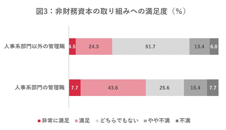 自社の非財務資本への取り組みに満足しているかを聞いたところ、「非常に満足(4%)」「満足(24%)」で、満足している管理職は人事系部門以外の部署において3割を切る結果となった。一方、同じ設問に対して、人事系部門の管理職に聞いたところ「非常に満足(7%)」「満足(43%)」で、満足している人事系の管理職は全体の5割に至った。