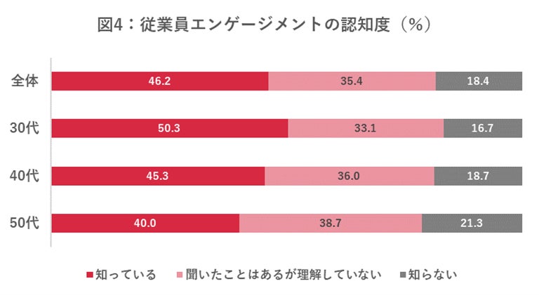●「従業員エンゲージメント」を知っている管理職の割合は46%。世代別で見ると、30代の認知率は50%、