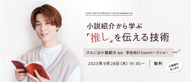 株式会社モリサワは、フォントの情報発信をする「FONT SWITCH PROJECT」の企画において、TikTokで注目を浴びるけんご@小説紹介先生をお迎えした学生向けZoomトークショー “小説紹介から学ぶ「推し」を伝える技術” を2023年9月28日(木)開催します。