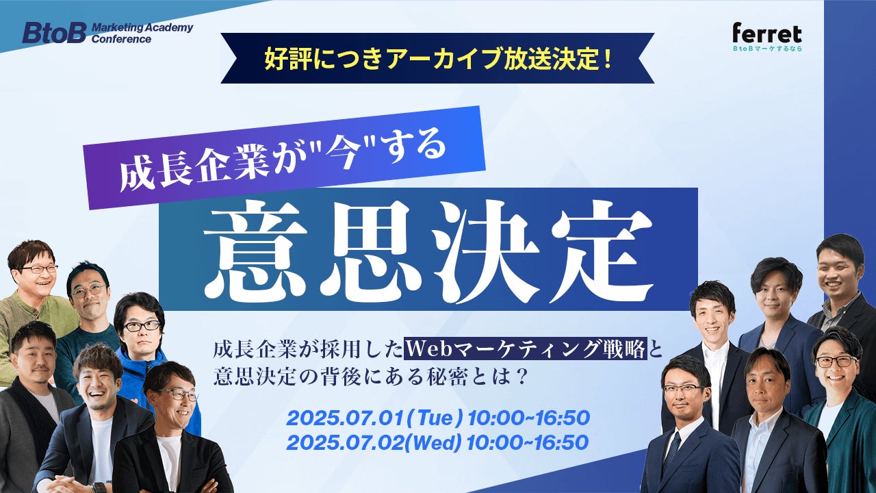 2025年6月10日に開催され、大変ご好評をいただいた「BtoB Marketing Academy Conference 〜成長企業が"今"する意思決定〜」。この度、全セッションのアーカイブ配信が決定しました。