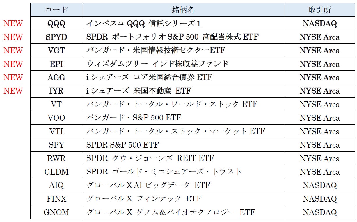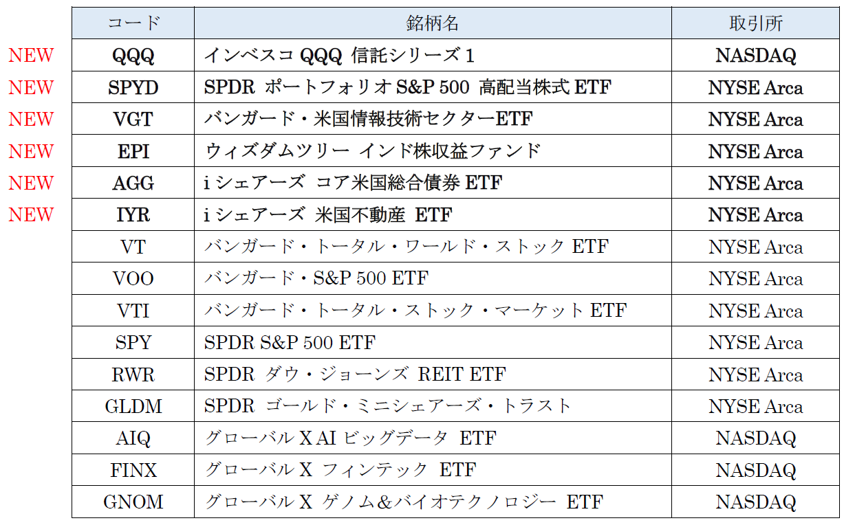 - 大型ハイテク株やS&P 500の高配当株など、人気が高いETF 6銘柄を追加 -