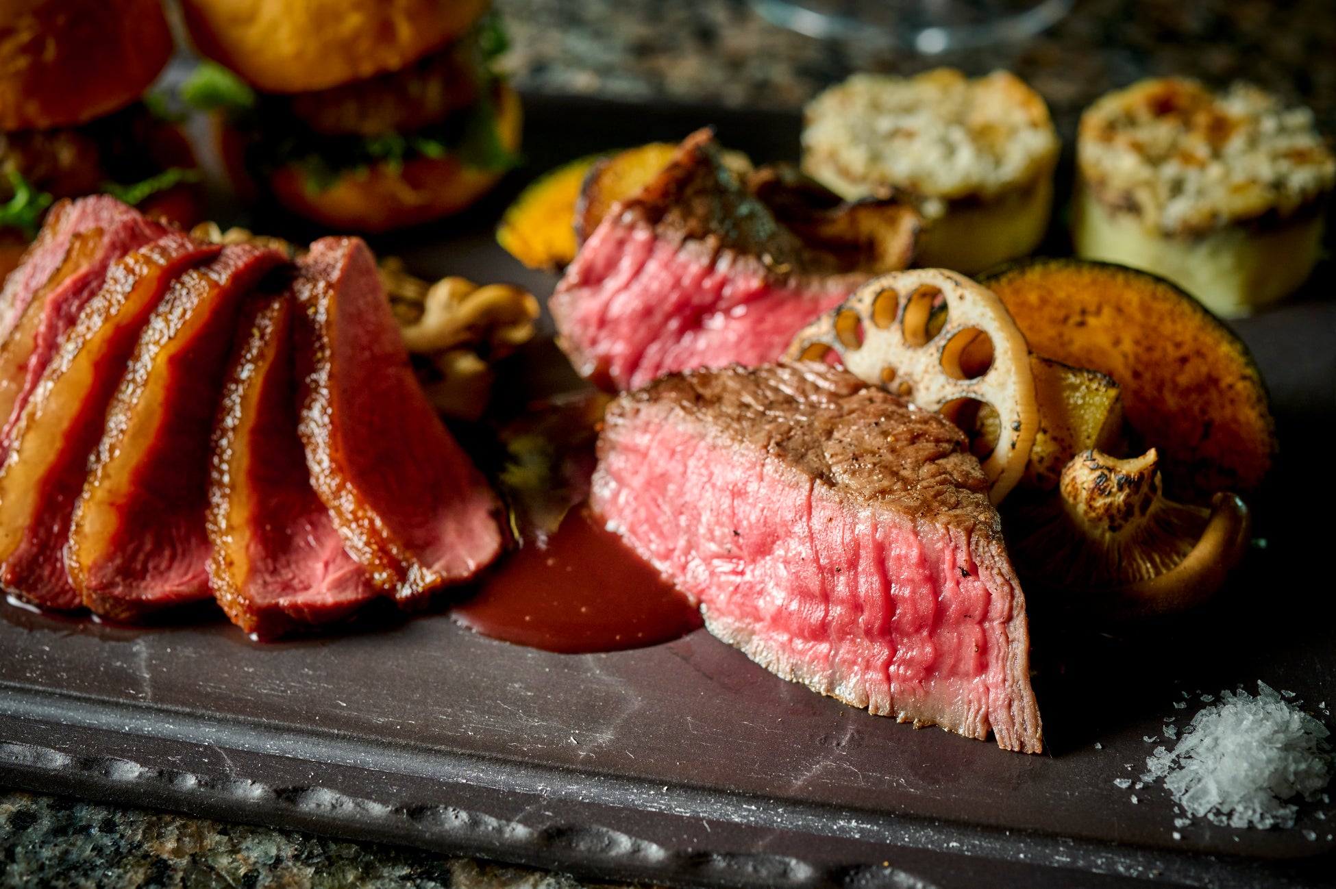 丁寧な火入れでミディアムレアに焼き上げた飛騨牛を豪快にカット!柔らかな食感と肉の強い旨味が堪能できる主役の一品です。隣にはスモーキーな香りが食欲をそそる、鴨肉の燻製ローストが並びます。赤ワインをベースにしたクラシックなソースと、お肉の味わいをダイレクトに楽しめる塩をお好みで合わせてお召し上がりください。