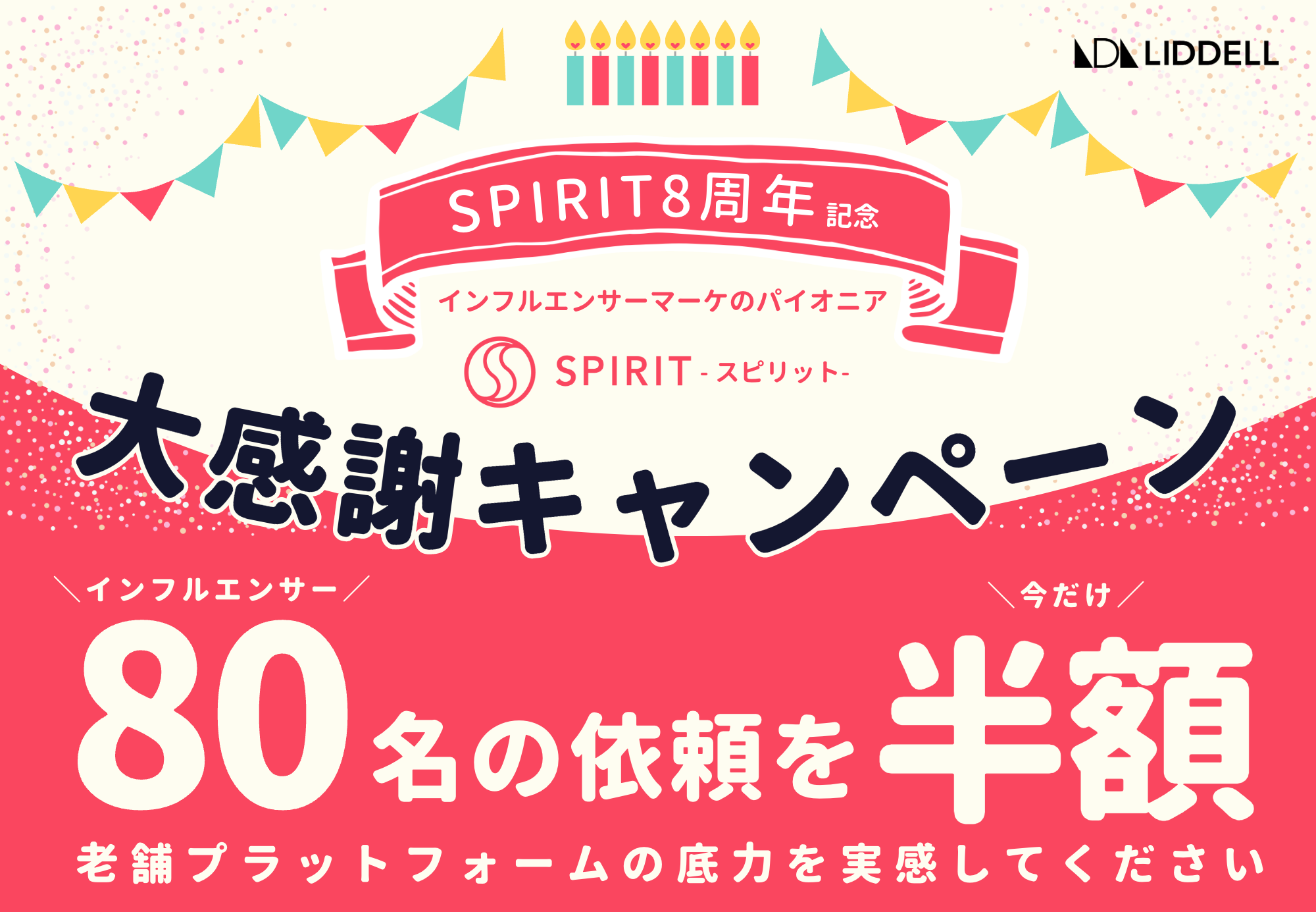 【8周年】インフルエンサーマーケのパイオニア『SPIRIT(スピリット)』8周年を記念して、80名依頼パックを50%オフ!超特価の半額でご提供!